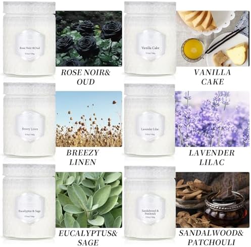 About this item 【6 Pack Aromatherapy Candle Set】Our aromatherapy candles set use high-quality fragrances, which emit a pleasant scent when burning, which can soothe nerves, purify the air, and eliminate odors. We have carefully blended 6 different scents, Rose Noir & Oud / Vanilla Cake / Breezy Linen / Lavender Lilac / Eucalyptus & Sage / Sandalwood & Patchouli. These candles for home scented are definitely a great tool to spice up your life. 【Create Comfortable Atmosphere】Aromatherapy candle emits a pleasant aroma when burning, effectively relieves stress and relaxes the body and mind, while also purifying the surrounding air, and is very suitable for home or office use, aromatherapy, yoga, bathing, weddings, family reunion, insomnia, meditation, etc., and is a perfect addition to the bathroom, bedroom, kitchen, living room, office, etc. 【100% Soy Candles】Scented candles set are made of natural soy wax and high-quality fragrances. The fragrances are evenly mixed with soy wax and can continuously emit a rich fragrance when burned. Soy wax does not produce harmful gases when burned, which is cleaner and more environmentally friendly. It can be safely used in rooms, living rooms, offices, bathrooms and other places. 【Long Lasting Fresh Air】Each aromatherapy candle jar can burn continuously for 35-40 hours, providing a total of 180-240 hours of fresh air; the soy candle uses an upgraded pure cotton wick to make the candle burn more fully and reduce the probability of the flame going out during the burning process. 【Best Gift for Women】Our candles for home scented is best gift for women and can be used as a birthday gift, Christmas gift, Mother’s Day gift, wedding anniversary gift. In addition, it can also be used as home decoration candle, can be integrated into any home style such as modern, country, farmhouse, dormitory, office, etc. › See more product details
