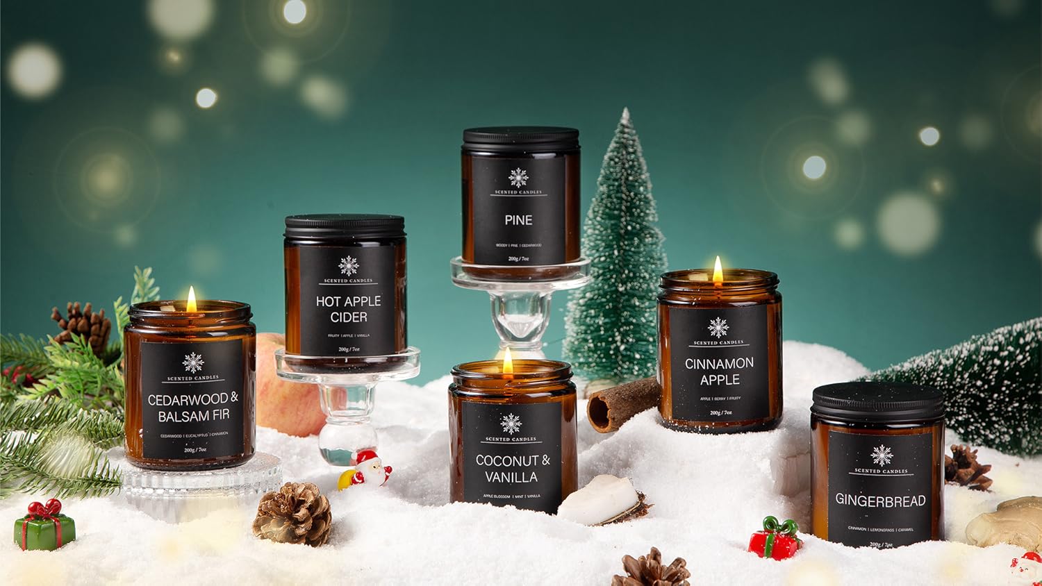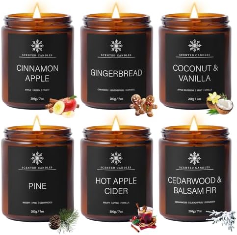 About this item Perfect Winter Gift: Aromatherapy candle set with charming winter scents, This set comes with 6 candles, including Vanilla, Cinnamon apple, Pine, Gingerbread, Hot Apple Cider, Cedarwood & Balsam Fir. Each candle is designed to evoke the warm and inviting feeling of the winter season, Candles for home scented can make you relax and enjoy the tranquility of winter. Candles for Home Scented: Winter is a time to enjoy the holidays, The warm light of the candle brings a touch of warmth to the cold winter night, allowing people to feel the warmth of home and the power of love, Place them strategically in your living room, dining table, bedroom or bathroom to add a touch of warmth to every space in your home. Long-Lasting Aromatherapy: The scented candles are made of high-quality soy wax (no petroleum or paraffin), with cotton wicks to minimize ash and clumps. 7 oz * 6 scented candles can burn for about 300 hours, allowing you to enjoy a longer-lasting aroma and a comfortable experience. Christmas Gifts Set: Whether for personal use or as a gift for family and friends, or just to show someone you care, this collection of winter scents will delight your heart with beautifully packaged, festive candles. More than just a gift, this is an invitation to stress relief and enjoy the simple pleasures of winter. Gifts for Women or Men: You no longer need to worry about choosing gifts, leave it to us. Winter candle gift set is suitable for men or women, and is the perfect gift to express gratitude to family, friends, colleagues and loved ones. It is an ideal gift for birthdays, Christmas, Thanksgiving gifts and other special occasions. See more product details