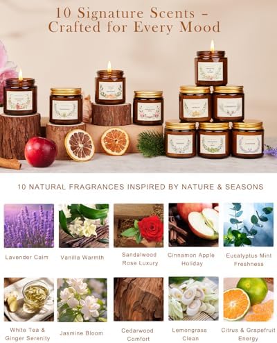 • 【10 Premium Soy Candles with Relaxing Scents】- Each candle is made with 100% natural soy wax and a cotton wick for a clean, even burn. Enjoy cozy fragrances like Lavender, Vanilla, Lemongrass, and Cinnamon Apple, blended with other natural scents that fill your home with warmth and comfort all winter long.