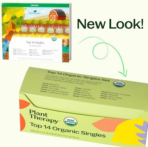 About this item OUR MOST POPULAR ESSENTIAL OIL SET: Top 14 Organic Singles Set includes our favorite single oils that can be used in a wide variety of ways. Great for people new to essential oils or anyone looking to restock. They can help with relaxation, focus, sleep, and so much more! EASY, AFFORDABLE WAY TO FIND YOUR FAVORITE: Here are the organic essential oils included in this set: Bergamot, Cinnamon Cassia, Clary Sage, Eucalyptus Globulus, Frankincense Carterii, Lavender, Lemon, Patchouli, Peppermint, Pink Grapefruit, Rosemary, Spearmint, Sweet Orange, and Tea Tree. BATCH SPECIFIC THIRD-PARTY GC-MS REPORTS: Every batch of oil from Plant Therapy goes through multiple rounds of internal organoleptic testing and GC-MS testing by third-party laboratories to prove purity and quality, all available to the public. HIGH-QUALITY AFFORDABLE ESSENTIAL OILS: At Plant Therapy, our goal is to positively impact the lives of as many people as we possibly can, by selling such a high-quality product at an affordable price. Be confident knowing you are purchasing quality oils at direct-to-consumer prices. CERTIFIED AROMATHERAPISTS ON STAFF: Our customers are our #1 priority and we’d love for you to join the Plant Therapy Family. Our Certified Aromatherapists are happy to help you with all of your essential oil questions. Plus, we offer a risk-free 100% satisfaction guarantee! See more product details
