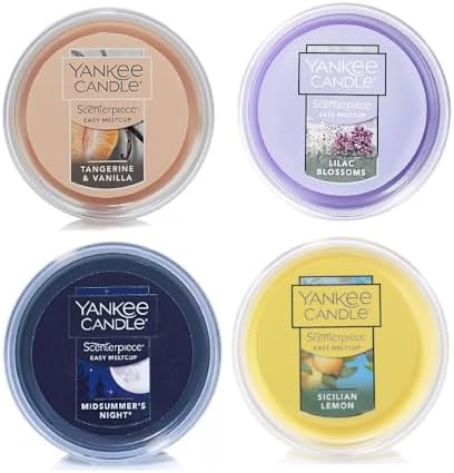 About this item SET OF 4 assorted sample scents including Bahama Breeze, Lilac Blossoms, Cinnamon Stick, and Juicy Citrus with Sea Salt — PLEASE NOTE on rare occasions some fragrances may need to be substituted without notice Experience a wide variety of scented notes from tropical blends of pineapple, grapefruit and mango, along with deep purple lavender groves, fragrant imported cinnamon bundles with cloves, and wonderfully cool lush edged with salt Change scents in seconds. First, select a stylish Easy MeltCup electric warmer. Then choose an Easy MeltCup in your favorite fragrance. Remove lid, place cup in the warmer, flip on the switch and enjoy! Heat resistant cups are always cool to the touch, you can swap them out as often as you like, continuing to use and re-use each cup for a total of up to 24 hours melt time Must be used with a Yankee Candle Scenterpiece Easy MeltCup Warmer which comes in a wide variety of designs — or compatible electric warmers which feature a flameless heater to quickly melt the wax (sold separately) See more product details